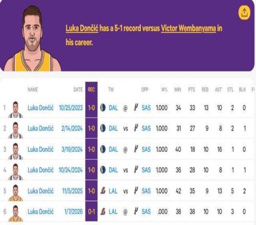 本场比赛湖人队两大主力詹姆斯和里夫斯休战,东契奇领军出战。最终马刺轻取湖人,这也是文班亚马自2023年进入联盟以来,首次率领马刺击败东契奇所在的球队。在此之前,文班亚马面对东契奇5战5败。